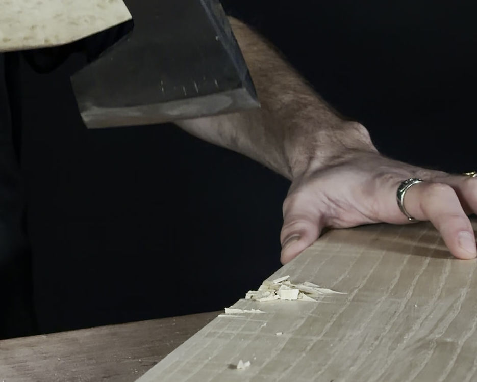 L a hache. Une nouvelle ère commence. Julien lance sa collection de mobilier en bois texturés à la hache. Hommage à la libération de soi, chaque entaille sort d'un geste franc et assumé.
